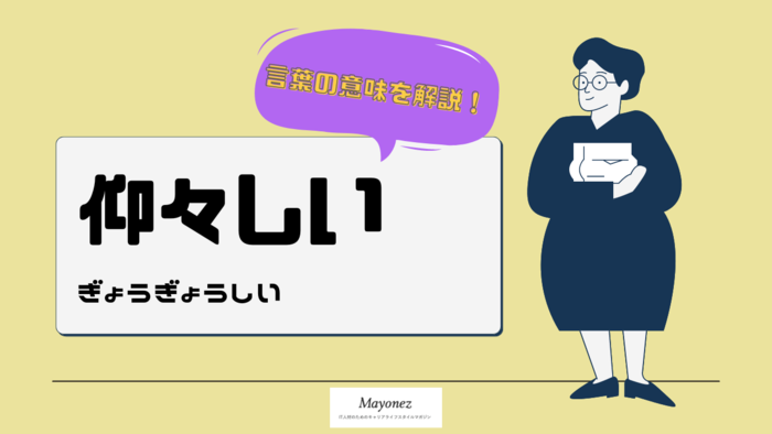 「仰々しいってどう読むの?」 「仰々しいの意味を知りたい」 「仰々しいの使い方は?」 テレビや新聞などでよく目にする「仰々しい」という言葉ですが、正しく読んで使うことができていますか。 この記事では、「仰々しい」について、読み方や意味、そして使い方を例文も併せた上で紹介しています。さらに類義語や英語表現についても解説しているので、海外の方とのやりとりなど様々なシーンで役に立つでしょう。 この記事を読むことで、「仰々しい」を誤った読み方や使い方をしてしまって恥ずかしい思いをすることがなくなります。また、類義語を上手く使い分けることで博識な印象を与えることもできるでしょう。 「仰々しい」について不安がある方や語彙力を増やしたいと思っている方は是非この記事をチェックしてみてください。