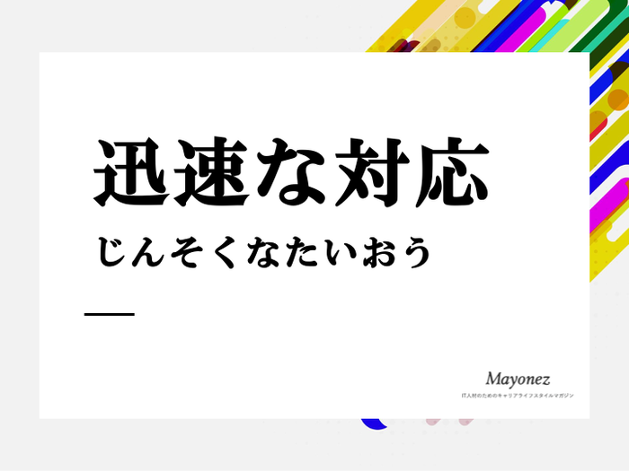「迅速な対応」は難しめの熟語を使った堅い表現ですが、使い方は難しくありません。定型となっている使い方や言い回しがあるので、例文を覚えておけば応用できます。 「迅速な対応」はビジネスでよく使われるため、顧客や取引先、目上の人に対して使うときは、敬語表現にするときに少々注意が必要になります。丁寧にしようとするあまり間違った敬語を作ってしまわないよう、敬語表現を覚えておきましょう。