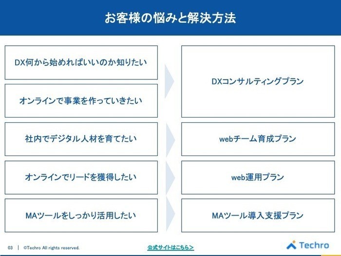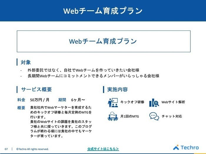 天野:テクロ社でご提供できるプランは、大きく分けて2つございます。 1つは専門家を雇うのが難しい場合に、社内でデジタル人材を育てることを重視した「Webチーム育成プラン」です。 もう1つは外部の人材を活用して、一気に立ち上げをおこなう「Web運用プラン」です。 −「Webチーム育成プラン」の内容について教えてください。