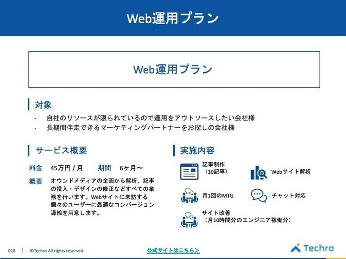 天野:こちらはテクロ社が持っている下記のノウハウを、お客様のチームに移植することが最終ゴールです。 ・オウンドメディア ・Webマーケティング それに向けてキックオフの研修から月一回のミーティング、チャット対応などをおこなっています。 −もう1つの「Web運用プラン」はどのような内容でしょうか?