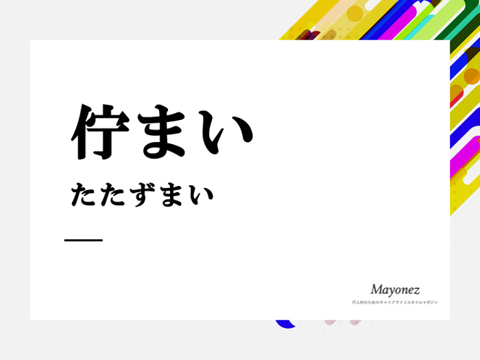 「居住まい(読み:いずまい)」は、「座っている様子」を表す言葉です。 この「居住まい」を用いた表現として有名なのは、「居住まいを正す」でしょう。この表現は、礼儀正しく座り直すという意味をもつ他に、姿勢を正すために気持ちを切り替える、態度を改めるといった意味も持ち合わせています。 同じように「居住まい」を用いた表現に、「居住まいを崩す」というものがありますが、これは「緊張が解けてキチンとしていた姿勢を崩す」といった意味になり、上述の「居住まいを正す」の反対表現になります。 「佇まい」が人やものに対して使えるのに対し、「居住まい」は人に対してだけ使える言葉です。併せて覚えておきましょう。
