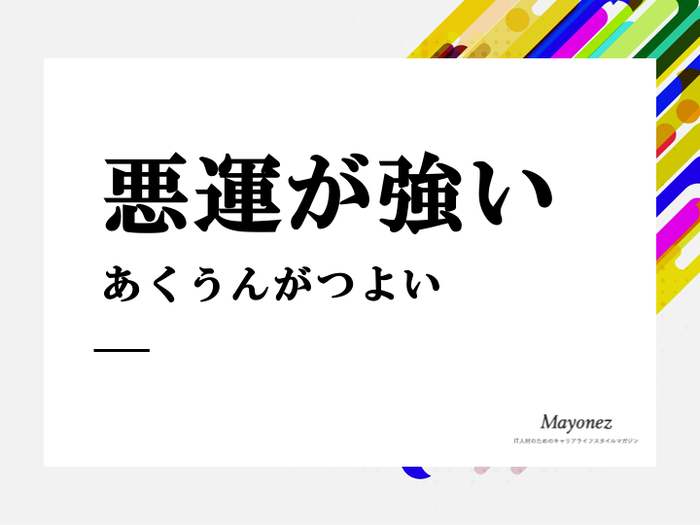 weblio辞典によると、「悪運」には2つの意味があります。 「悪運が強い」とは、1つ目の意味を用いた慣用句で、よからぬ事について運が強いさまを意味しています。悪いことをしていることが前提になっているため、使い方には注意が必要です。