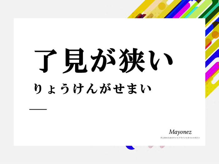 まず「了見」とは、「りょうけん」と読み、考え、気持ち、物事の考え方や捉え方などの意味があります。 「了見が狭い」は「りょうけんがせまい」と読み、考えの幅が狭いことを指し、ものの見方が偏っているという意味を持ちます。 自分だけの狭い考えを持ち、他人の考えや気持ちを理解しようとしない人の事を「了見が狭い」と表現します。 「了見が狭い」は、そのような「人」に対して使う言葉です。 自分が「了見が狭い」と気付いた時や、他人から指摘をされた時に使うこともあります。