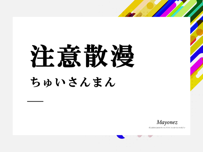 「注意散漫」は「ちゅういさんまん」と読み、集中力を欠いている様子を表した言葉です。「一定のことに集中できず、あれこれと気が散っているさま」という意味があります。 ビジネスシーンや日常生活で周囲に言われた経験がある人もいるのではないでしょうか。例えば、仕事中にスマートフォンを見たり、勉強中に窓の外を見ていて、「注意散漫だね」というようにです。 「注意散漫」は、目の前のことに集中できず、仕事や勉強以外に意識がいってしまう際に使われます。仕事や勉強は一例ですがほかにも、運動中や運転中、子どもと遊んでいる時や料理している時など、「注意散漫」はさまざまな場面で使われる言葉です。