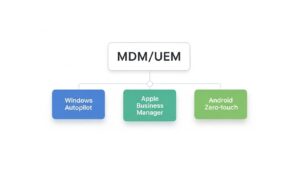 まず、自社の環境を整えます。中核となるのはMDM (Mobile Device Management) またはUEM (Unified Endpoint Management) ソリューションです。Microsoft Intuneなどが代表的ですが、自社のデバイス構成やセキュリティ要件に応じて最適なツールを選定します。