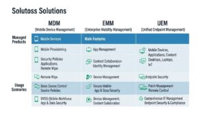 | 比較項目 | MDM (モバイルデバイス管理) | EMM (エンタープライズモビリティ管理) | UEM (統合エンドポイント管理) |