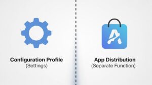 構成プロファイルの主な役割はOSやデバイスの「設定」を管理することです。業務アプリ本体のインストール、更新、アンインストールは専門外です。アプリ管理は、Apple VPPやMicrosoft Intuneのアプリ展開機能など、MDMが持つ別の機能を利用して行います。