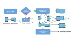 まず、「OSバージョン」「暗号化」「パスコード」など、自社が守るべきセキュリティポリシーを具体的に定義します。次に、MDMや資産管理ツールを用いて、これらのポリシー設定を組織内の全端末に展開・適用し、「評価基準」を明確にします。