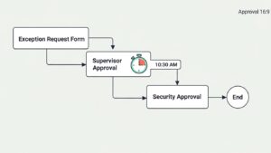 例外を必要とする従業員が、正式な手続きで申請するワークフローを整備します。申請書には「理由」「期間」「代替となるセキュリティ対策」を明記させ、直属の上長と情報セキュリティ担当部署の承認を必須とすることで、安易な例外申請を防ぎます。