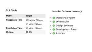 「深刻な脆弱性パッチは、公開後72時間以内に95%のデバイスに適用完了させる」といった具体的な目標(SLA)を設定します。また、「インストール済みソフトウェアを定期的に棚卸しし、ライセンス数を監視する」といったポリシーも、法的リスクを回避するために不可欠です。