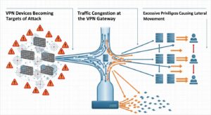 前述の通り、VPNの最大の課題は、一度認証に成功するとネットワークに広くアクセスできてしまう点です。マルウェアに感染した端末から接続された場合、攻撃者はVPNを侵入口とし、重要なサーバーへと内部で水平移動(ラテラルムーブメント)を試みます。一度侵入を許すと被害が甚大になる脅威を常に抱えています。