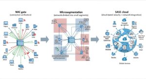 ゼロトラストの考え方は、社内だけでなくクラウド環境にも拡張されています。その概念を体現するのがSASE(Secure Access Service Edge)です。SASEは、ネットワーク機能とセキュリティ機能をクラウド上で統合的に提供するモデルで、ユーザーがどこにいても安全なアクセスを実現します。NACが社内ネットワークにおけるゼロトラストの基盤だとすれば、SASEは社内外の境界をなくし、すべてのアクセスに統一されたセキュリティを提供する、ゼロトラストの包括的なアーキテクチャと言えるでしょう。
