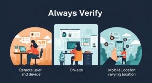ゼロトラストとは、「何も信頼しない(Zero Trust)」を前提とし、すべてのアクセス要求をその都度検証するセキュリティモデルです。社内外を問わずすべてのアクセスを疑うため、ネットワークの境界が曖昧になった現代の働き方に適しています。