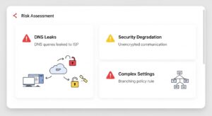 最も注意すべきリスクが「DNSリーク」です。DNSは「example.com」のようなドメイン名をIPアドレスに変換する仕組みです。通常、VPN利用時はこのDNSリクエストもVPNトンネルを通り、匿名性が保たれます。