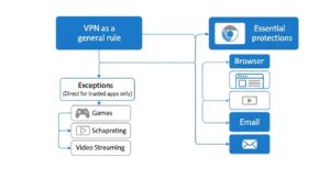 VPNの基本的な役割は、全ての通信を暗号化し、サイバー攻撃からユーザーを保護することです。スプリットトンネルは、意図的に一部の通信をこの保護対象から外すことを意味します。