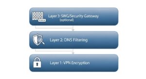 DNSの名前解決の段階で、フィッシング詐欺サイトやマルウェア配布サイトなど、悪意のあるWebサイトへのアクセスをブロックする機能です。スプリットトンネルでVPNの保護外になっている通信であっても、危険なサイトへアクセスしてしまうリスクを大幅に減らすことができます。VPNの暗号化とは異なるレイヤーでセキュリティを提供し、多層的な防御を構築します。