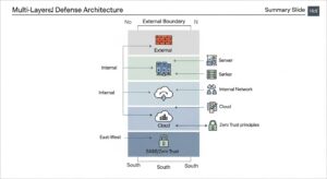 境界防御モデルの弱点を補うのが、東西トラフィックを監視する内部ネットワーク防御モデルです。