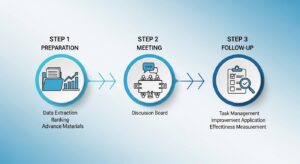 効果的な検知ルールレビュー会は、行き当たりばったりではなく、体系立てられたプロセスに沿って進めることが成功の鍵です。ここでは、事前準備、当日の進行、そして事後フォローアップの3つのステップに分けて、具体的な進め方を解説します。