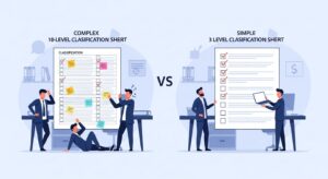 運用の複雑化とコスト増大 分類階層を5段階や10段階にしたり、部署・プロジェクトごとにルールを細分化したりすると、従業員は都度、複雑な基準を確認し判断する必要が生じます。この判断コストと時間のロスは大きく、教育コストや管理部門の工数も増大します。