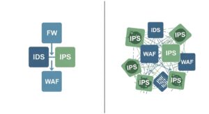 多層防御の本来の目的は、ファイアウォール、IDS/IPS、WAFといったそれぞれ役割の異なるセキュリティ機能を適切な場所に配置し、異なるレイヤーで多様な脅威を検知・遮断することです。例えば、ネットワークレベルの攻撃はIDS/IPSで、Webアプリケーションの脆弱性を狙った攻撃はWAFで、というように役割を分担させるのが理想です。
