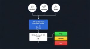 そこで重要となるのが、IOCの一つひとつに品質スコアを付与するアプローチです。IOC品質スコアとは、そのIOCが持つリスクや確からしさを数値化・可視化する仕組みです。このスコアに基づいて、対応の優先順位を判断したり、Detection Ruleの精度を評価したりすることで、SOC運用全体の効率化と高度化を図ります。品質スコアを導入することで、「どの脅威情報が信頼でき、緊急性が高いのか」を客観的な基準で判断できるようになり、勘や経験だけに頼らないデータドリブンなインシデント対応が実現します。これにより、セキュリティチームは限られたリソースを最もリスクの高い脅威に集中させることができ、組織全体のセキュリティレベルを向上させることが可能になるのです。