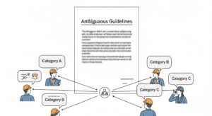 データラベリングの品質を担保する「アノテーションガイドライン」の定義が曖昧だと、作業者ごとに解釈が異なり、ラベルの一貫性が失われます。例えば、「少し攻撃的」なコメントを「不適切」と判断するか否かなど、主観が入りやすい項目の判断基準が明確に言語化・事例化されていないケースが典型です。