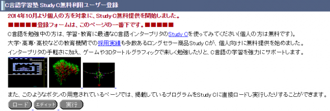 高専や大学の授業で、C言語の学習用教材として採用された実績がある、C言語初心者向けの無料ソフトウェアです。以前は有料の商品でしたが、現在は、個人の利用であれば、ユーザー登録をすれば無料で使うことができます。