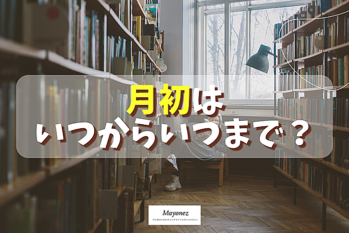 月の初めを「月初」、月の中頃を 「月央」、月の終わりを「月末」といいます。となりますとだいたい1日から10日ごろまでが月初、11日から20日ごろまでが月央、21日から終わりの日までが月末ではないかと考える場合と、10日までが月初では長すぎるのでということで1日から3日、長くても5日ぐらいになるのではないかという考えが多いようです。